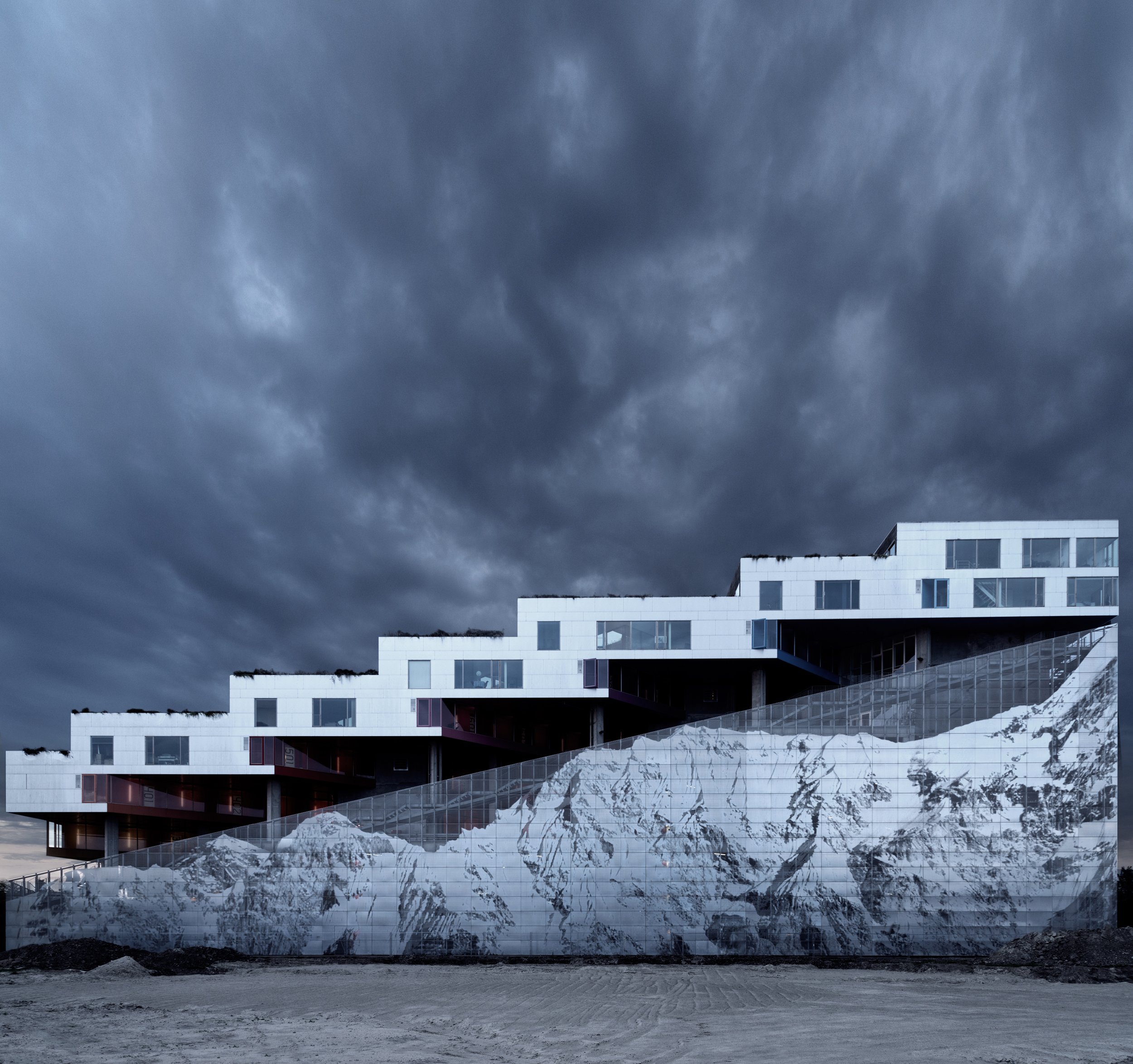 Architectural photography of VM Bjerget by Bjarke Ingels Group, photographed on a cloudy morning. The soft light highlights the building’s stepped form and the mountain-like structure behind the name The Mountain.